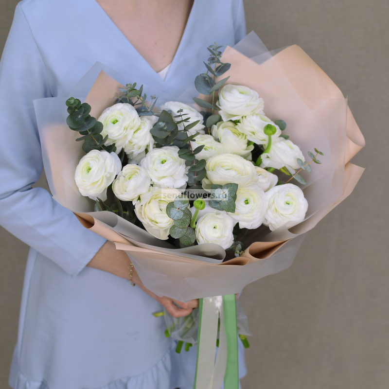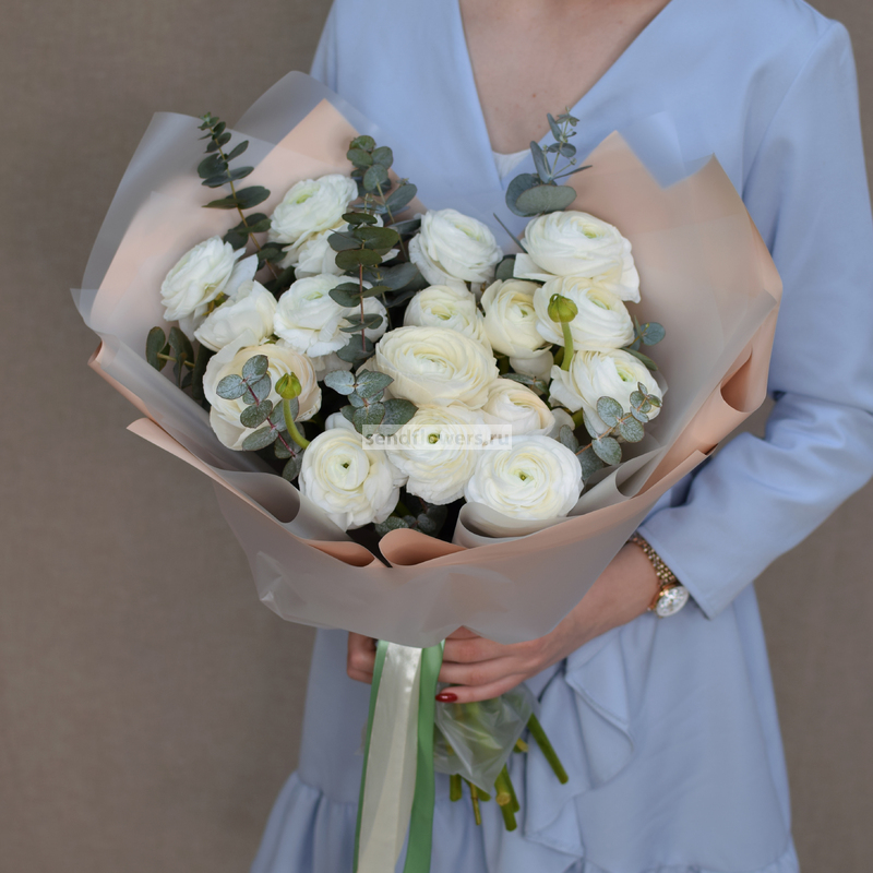 Состав: ранункулюс белый - 17 шт., эвкалипт - 4 шт.